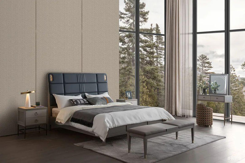 主卧拥有贴近自然的魔力,蓝色床屏色彩与外界的自然绿相互吸引,凹凸的线性块状软包设计,线条轻盈又流畅,打造了卧室背景强烈的立体感,金属包裹的感应小夜灯,守护你的每个夜晚,令睡眠更具安全感。