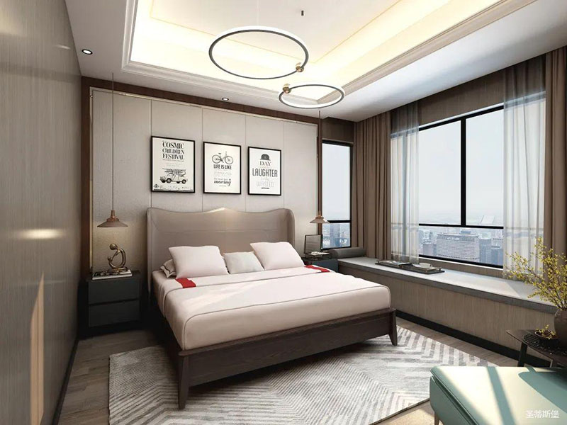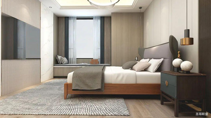 卧室精简有致,从质感出发,打造由内而外的优雅奢华感。背景墙、地板、地毯均拥有较强的肌理感,在加上金属软装饰物调和,让空间在低调内敛的基础上又不失时尚的高级感,飘窗进阶为温馨的一角,闲暇时,则可倚窗而坐,品一杯红酒,感受生活中的惬意时光。